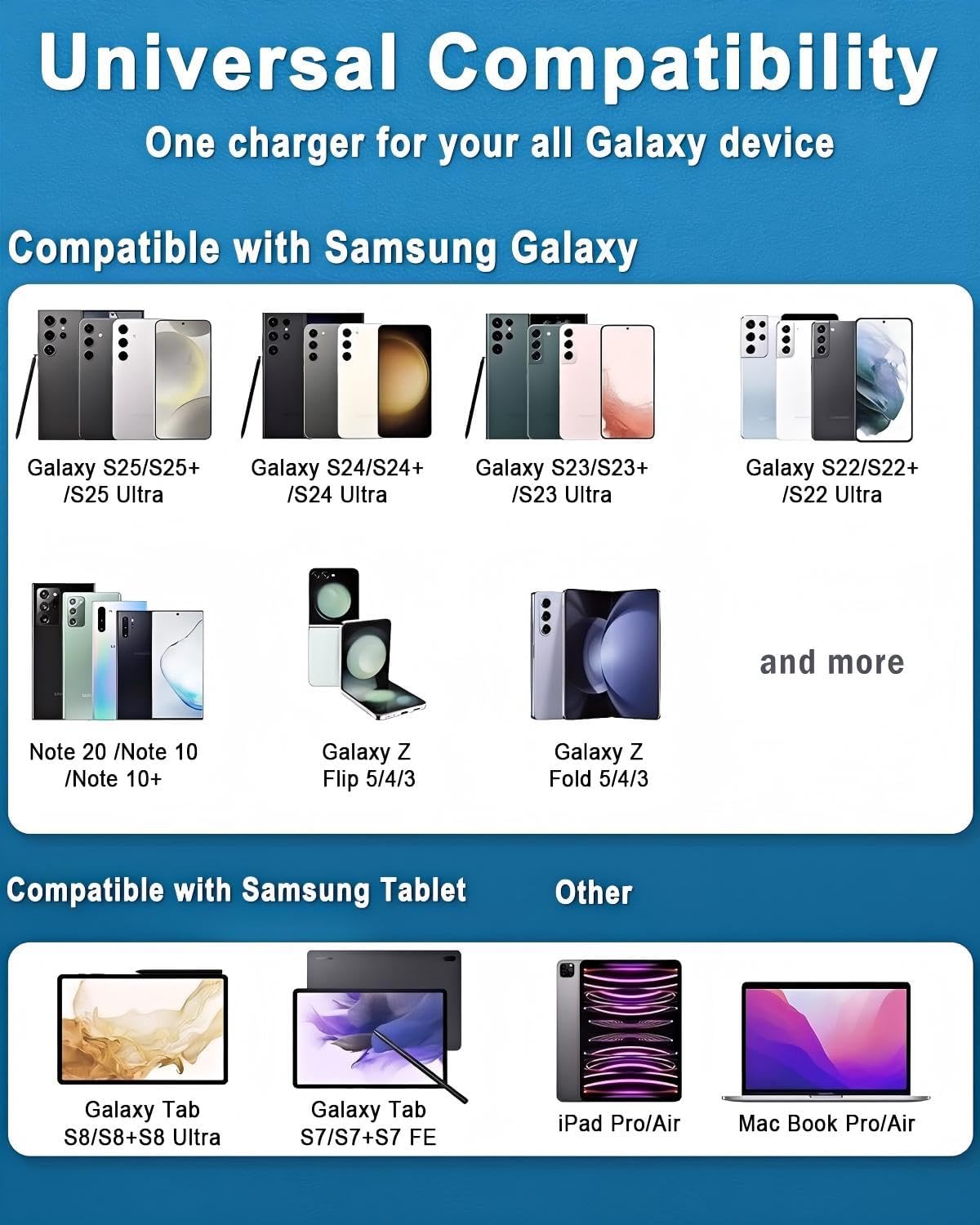 | Compatible Phone Models | Compatible with Samsung Galaxy S26/S26 Ultra/ S26+Galaxy S25/S25 Ultra/ S25+/S24/S24 Ultra/ S24+/S23/S23 Ultra/ S23+/S22/S22 Ultra/S22+/S20 Ultra/Z Fold 4/Z Fold 5/Z Flip 4/Z Flip 5/Galaxy Tab S8 S7 /Tab S8 S7 Plus/Tab S8 Ultra/ Galaxy Book3 Ultra/Galaxy Book3 Pro/Galaxy Book3 Pro 360/Galaxy Book3 360/Galaxy Book3/Galaxy Book2 Pro/Galaxy Book2 and 25W Super Fast Charging for Galaxy S21 Ultra/S21 Plus/S21/Note 20 Ultra/Note 20/Note 20 Plus/S20 Phone15/15Pro/15Pro Max |