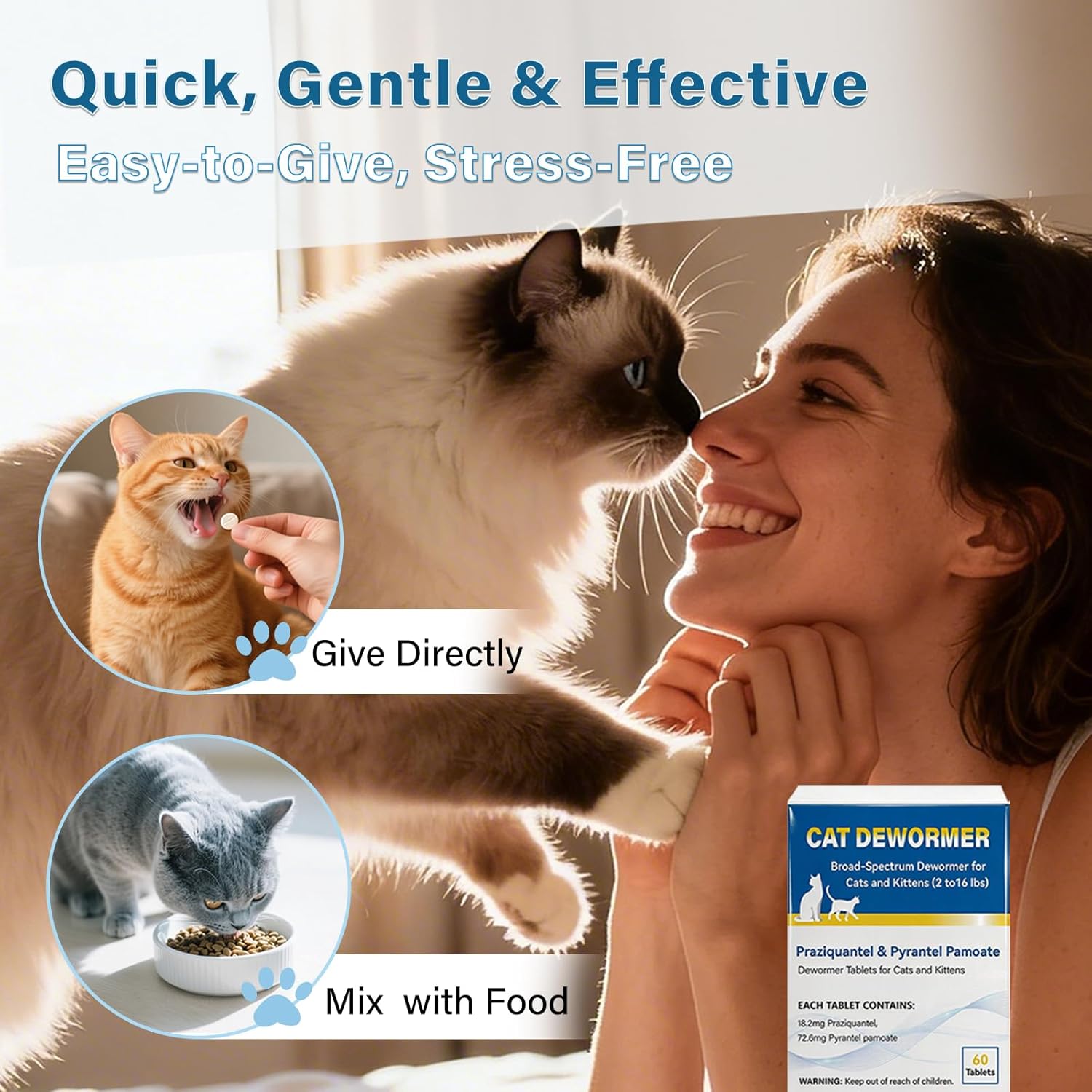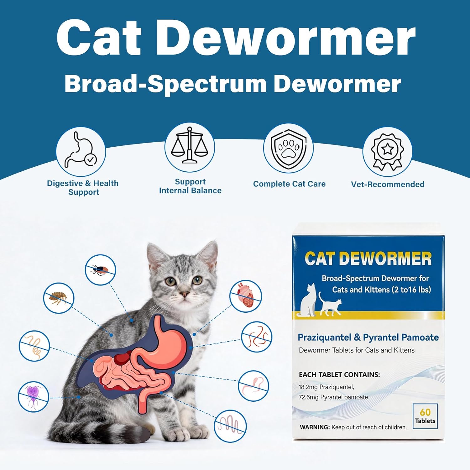 Broad Spectrum Dewormer for Cats and Kittens 2 to 16 lbs (Praziquantel & Pyrantel Pamoate) for Tapeworms, Roundworms & Hookworms, 60 Tablets