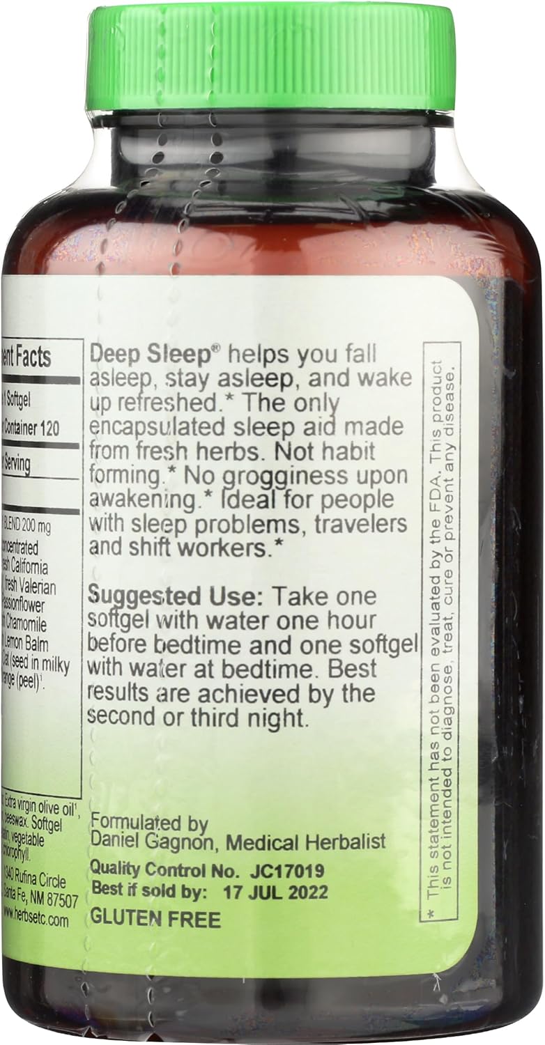 Herbs, etc. Herbal medicine deep sleep dietary supplement provides 200 mg. Of organic plant extracts to promote restful sleep. Made from a proprietary blend that includes california poppy, valerian, passionflower and chamomile, this supplement is free of alcohol and gluten. For best results, consume one softgel with water an hour before bed, then take another softgel with water at bedtime. This bottle contains 120 softgels of deep sleep dietary supplement.