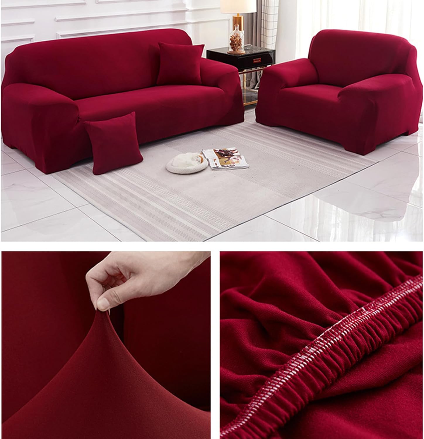 Product description: material: Polyester+Spandex Colour: Multi-colour available Size: details as shown, please read the buying guide carefully Season: All seasons Stylish Which can transform your old sofa to a new one or protect your new sofa. Great choice for homes with kids or pets. High Elasticity Great elasticity makes the cover suitable for many styles of sofa. The couch can be totally covered, ensures protection from daily wear and tears. Anti-Slip Foam Strips Anti-slip foam strips included in each package to help keep the couch cover stay in place better. Insert into the seams where is necessary. Easy to Care Machine washable for easy care and maintenance, separately in cold water on the gentle cycle. Do not bleach or iron. It is suggested to line dry. Warm Tips: 1.Please check the size and style of the product before purchasing. 2. We recommend buying a sofa cover that is slightly larger than the sofa bed. Since we manufacture our products by hand, there may be a deviation of approx. 1-3 cm. 3. Due to different computer display/screen, the color of the product may be slightly different from the picture. Scope of delivery: 1x Sofa Cover (no pillow)