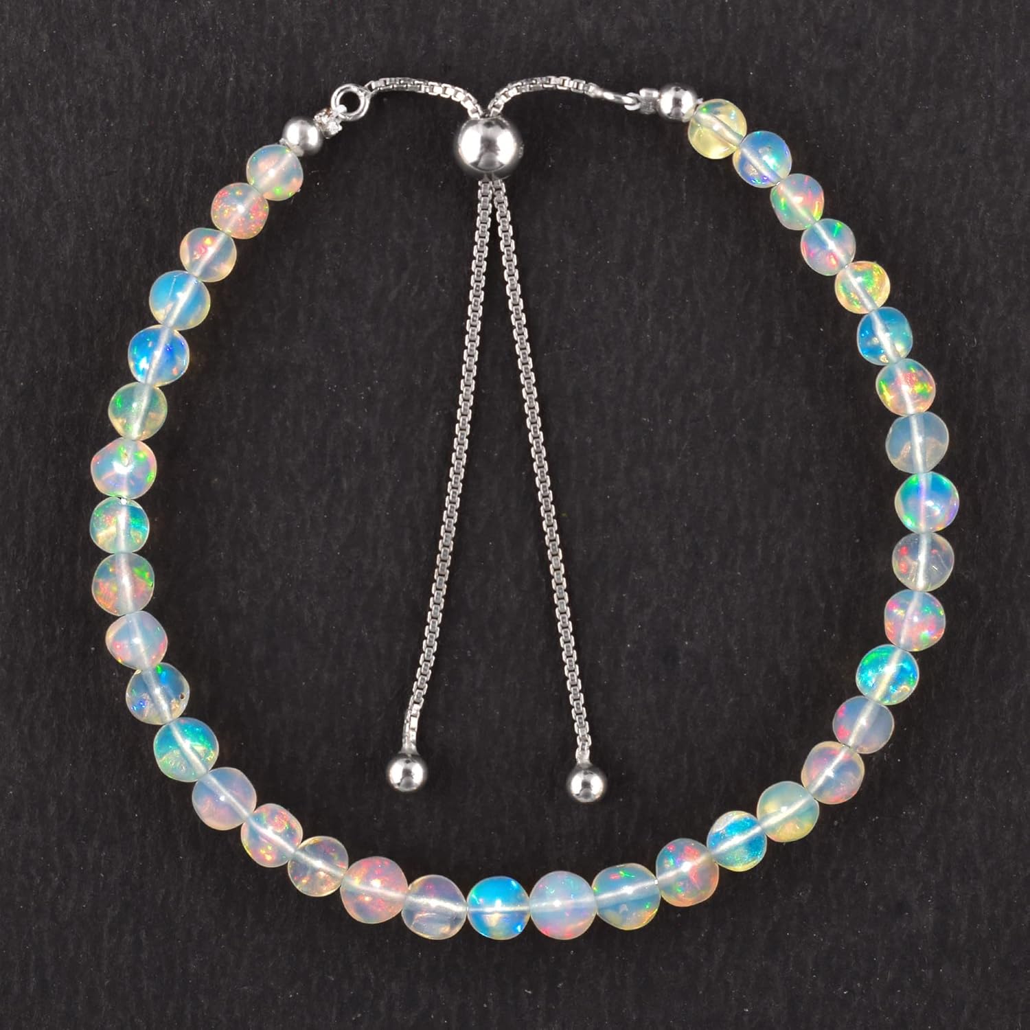 Rhodium Plated 925 Sterling Silver Handmade Jewelry made by OdrillionGemsGemstone - Ethiopian OpalStone Shape : Round Stone Cut : SmoothStone Treatment : NaturalJewelry Type : Adjustable Slider Chain Bolo BraceletMetal : 925 Sterling SilverClaw Type : Adjustable Slider Chain Bolo BraceletJewelry Length : 6+4inchQuality : AAA GradeAll our jewelry collection is an assortment of hand selected fine and fashion jewelry. We carry an extensive selection of precious and semi precious stones gemstones.Great gifts for your bridesmaids, woman, girls, wife, daughter, mom, sister, and bestiePerfect for Valentines Day, Christmas, Mother's Day, birthdays or any other occasion