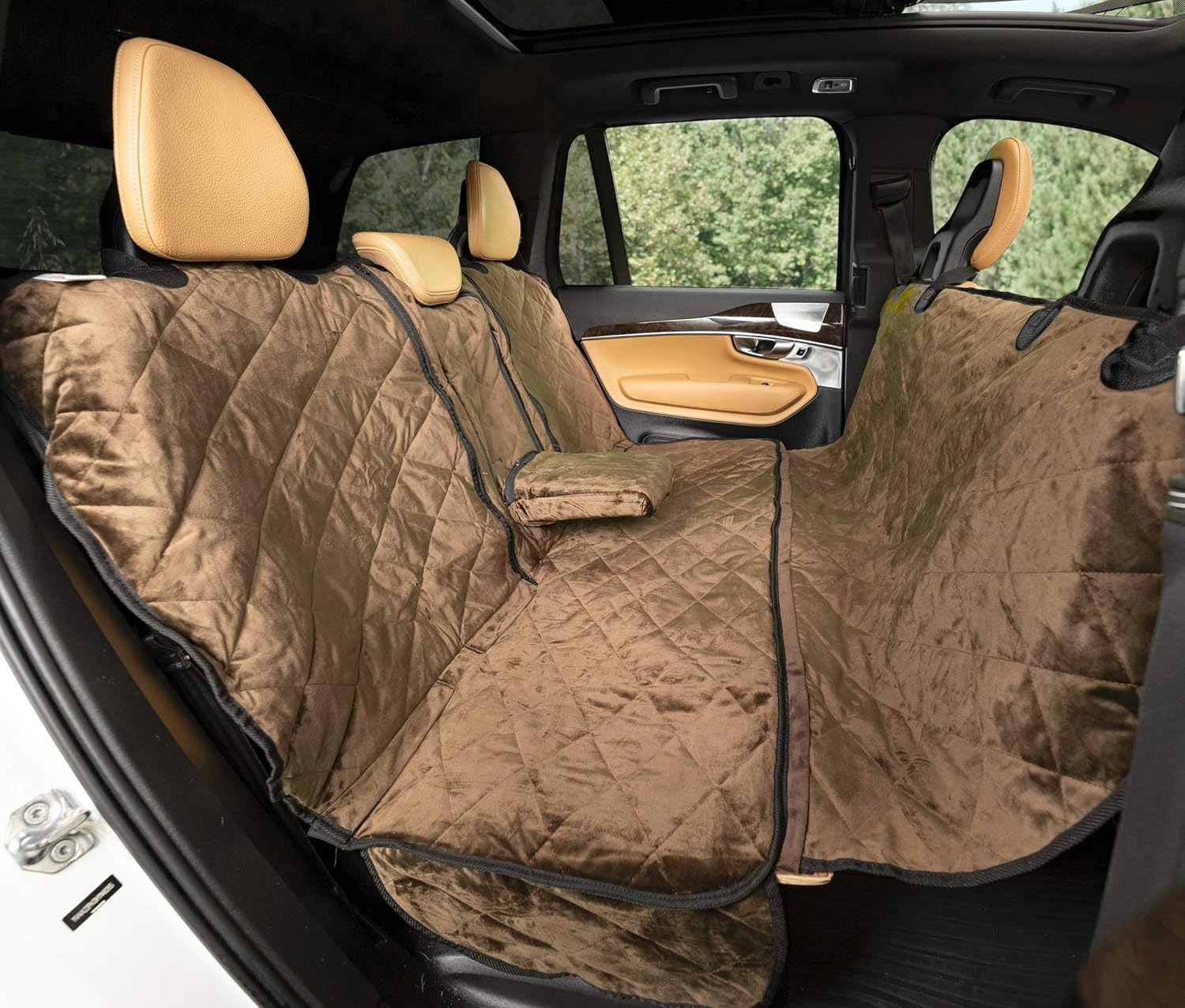 Our ultra premium velvet pet seat cover for dogs provides protection for the back seat of your vehicle from scratched upholstery, dander, fur, accidents, mud, and messes. Maintain full access to the center console and arm rests to provide your backseat passengers with the comforts of a typical rear seat. The convertible hammock on this dog back seat car cover is made with strong YKK zippers, and is easily installed and removed for day trips or long-term use; provides protection for the back of the front seats and interior. Our car pet covers for back seats are made from a luxurious plush velvet fabric that complements and protects the interior of your vehicle while keeping it pristine for years. The premium velvet construction is tough and doesn't tear with consistent use. Plush Paws products are chemical, azo dye, and metal-free to ensure the safety of your passengers.