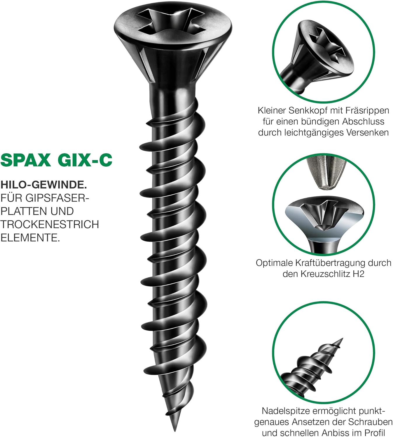 Spax - safety, quality and reliability since 1967. Drywall screw Spax GIX-C for gypsum fibreboards and dryscreed elements. For every conceivable material combination in drywall construction, Spax has the matching screws in the product range, which bear the name GIX. The flat cross slot trumpet head of the drywall screws allows flush countersinking, which provides a smooth surface when filling. Their striking black colour is a result of phosphatation, a corrosion protection that at the same time ensures that the screws do not form rust stains after filling. In addition, the GIX has a CE certification and comply with the DIN EN 14566 "Mechanical fasteners for plasterboard systems". The Spax GIX-C drywall screw is your best friend when you process plaster fibreboards. In which, not the outer cardboard layer, but cellulose fibres inside ensure stability, which makes them much harder than plasterboard. Accordingly, both the thread (Hilo thread) and the head is smaller and can be easily countersunk thanks to the milling ribs. Use SPAX GIX-C: The HiLo thread and the small milling head of the drywall screw are ideal for screw connections of gypsum fibre boards on all types of stand work as well as in the connection of dry screed elements. The needle tip of the coarse thread screws allows precise placement and quick penetration of the screws into the substructure. Box contents: 1 Spax box, 1000 pieces drywall screws HiLo thread, small milling head, Phillips H2, phosphated, thread diameter (Ød1) = 3.9 mm x total length (Ls) = 30 mm, fully threaded length (LgV) = 24 mm, head diameter (Ødk): 6.8 mm, bit not included. We also offer magazinated drywall screws for machine use with magazine screwdrivers.