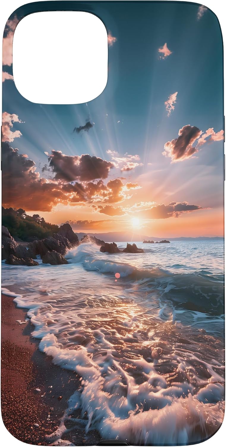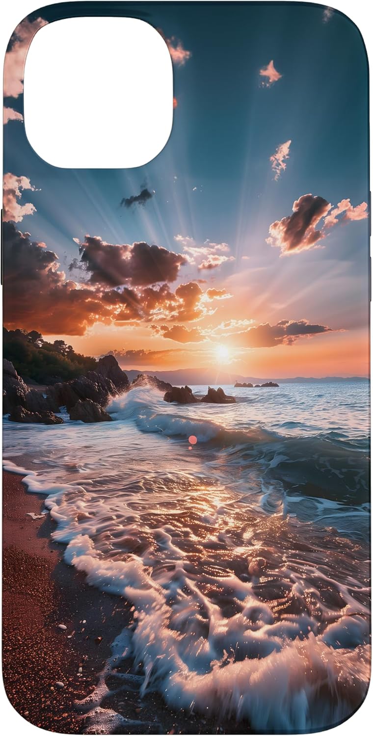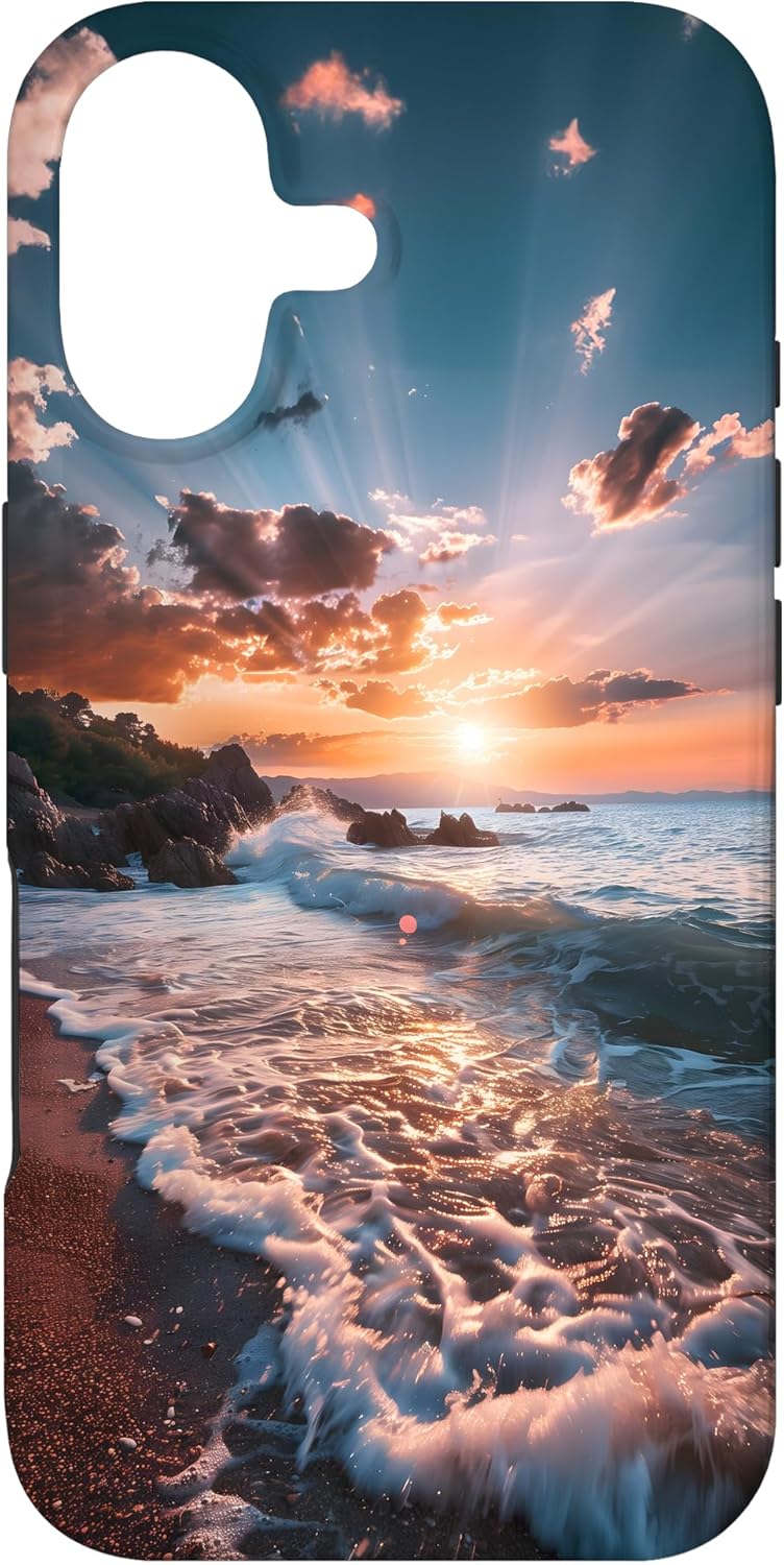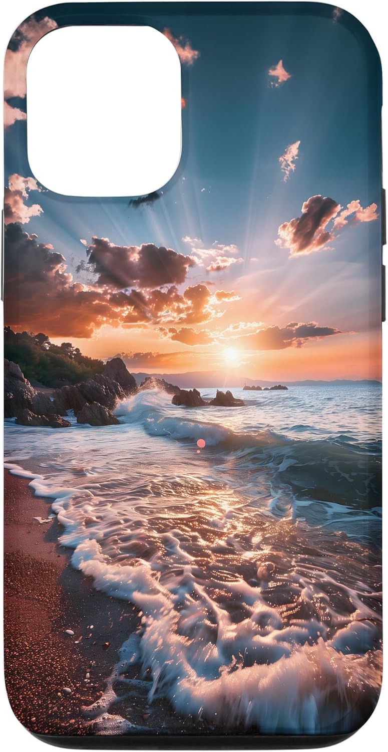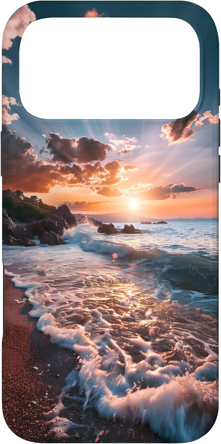 Perfect for beach lovers and nature enthusiasts, featuring a beautiful sunset over the ocean waves crashing onto the shore, capturing the essence of coastal serenity and relaxation. This design is one-of-a-kind and captivating. You'll surely make an impression and get many compliments. It unites style and refinement.