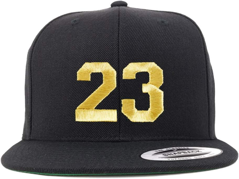 Our Number 23 Gold Thread Embroidered Flat Bill Snapback Baseball Cap - Made of 80% Acrylic, 20% Wool. High Quality Cap, White Embroidered in the USA. Original Premium Classic Snapback with Green Undervisor . 6 Panel High Profile, Hard Buckram, Constructed Cap . Adjustable plastic snap closure. One Size Fits Most.