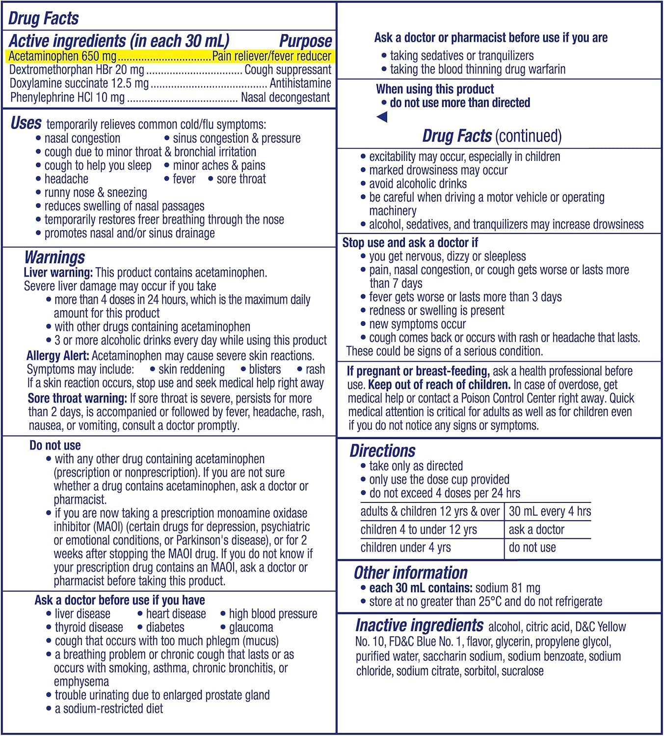 | Active Ingredients | Acetaminophen 650 Mg, Dextromethorphan HBr 20 Mg, Doxylamine Succinate 12.5 Mg, Phenylephrine HCl 10 Mg |