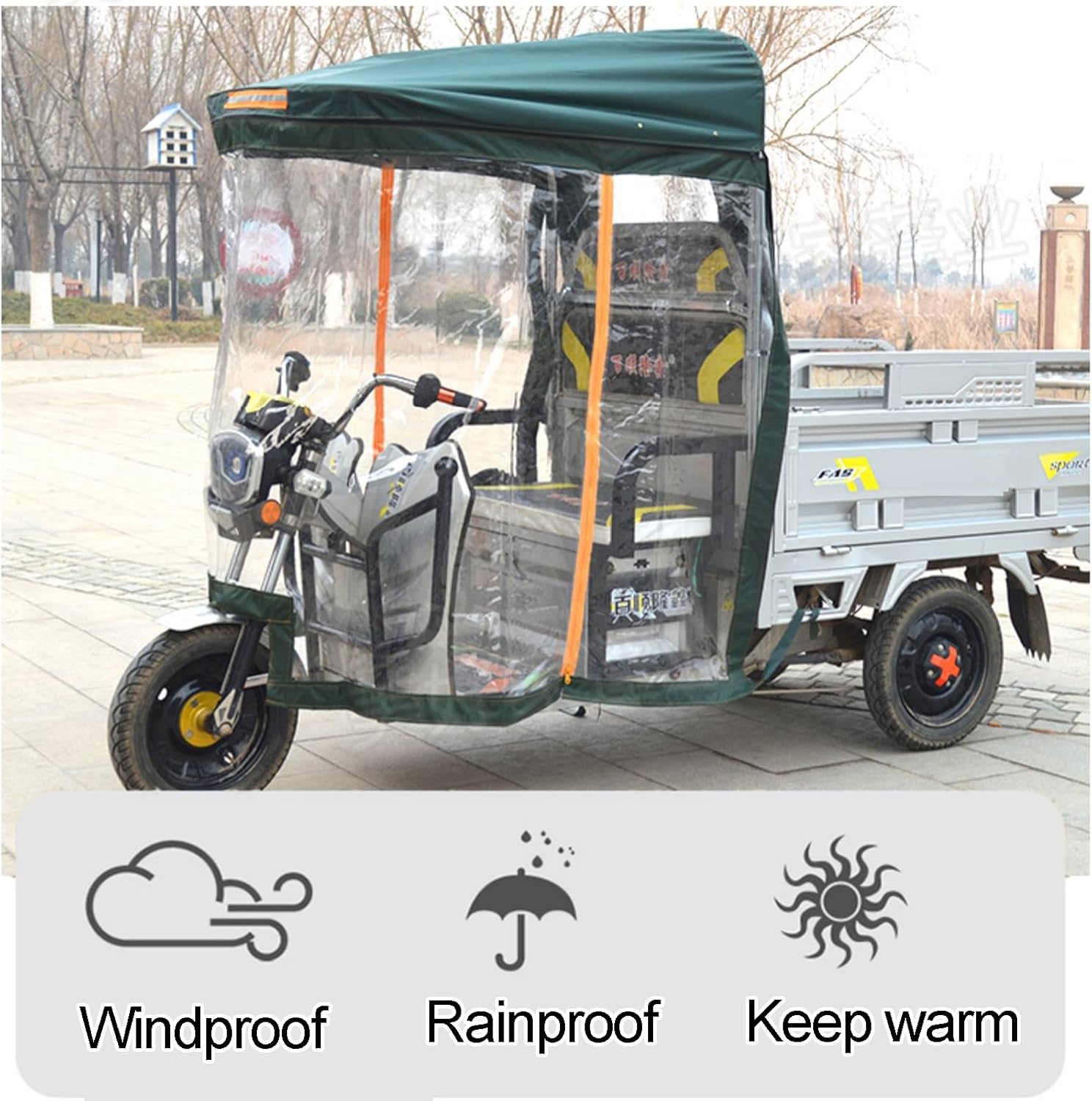 Our Tricycle Frame Canopy will create a nice and cool place in your sanbengzi and protect you from rain, heat, sun, snow, scratches and etc. With a sturdy steel frame, this Tricycle Frame Canopy is ideal for providing shelter. The reinforced frame and water-resistant polyester fabrics make the awning superior in material and excellent in workmanship. Install StepsStep 1: First, assembling the bracket.Step 2: Second, secure the bracket to the tricycle.Step 3: Third, attach the tricycle cover directly to the bracket.Step 4: Finally, you can use it.SpecificationProduct material: plastic, steelColor: Green Size: 70cm/28in , 75cm/30in , 80cm/31in , 85cm/33in , 90cm/35in , 95cm/37in , 100cm/39in , 105cm/41in , 110cm/43in , 120cm/47in , 130cm/51inWhat You Get ?Large rain curtain x1Screw pack x1Backrest column x2